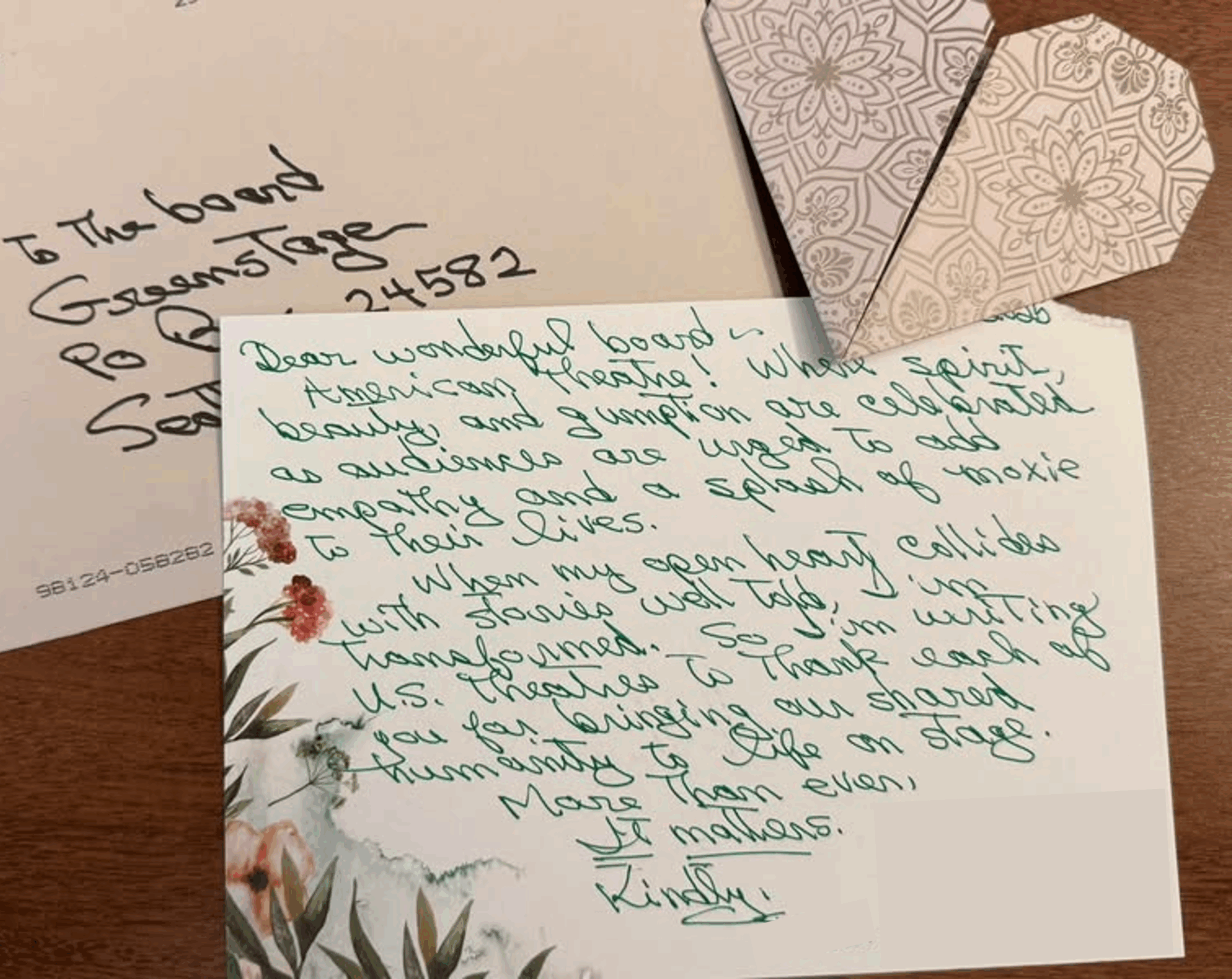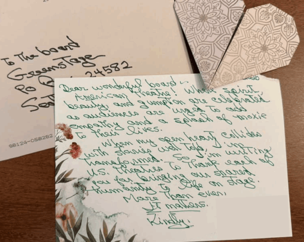 Recently, one fan of American Theatre sent GreenStage the handwritten card quoted above with an origami heart. Thank you, E, for reaching out to encourage us and other theater companies across the country.